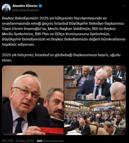 Bütçe toplantısının ardından sosyal medya hesabından bir paylaşım yapan Beykoz Belediye Başkanı Köseler, İBB Başkanı Ekrem İmamoğlu’na teşekkür etti.