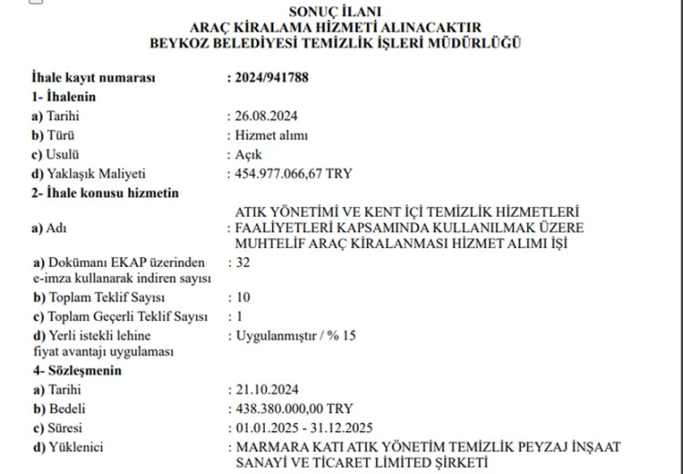 Beykoz Belediyesi Temizlik İşleri Müdürlüğü, 2024 yılının son 4 ayı için yaptığı ihaleyi Yön Temizlik kazanmıştı.