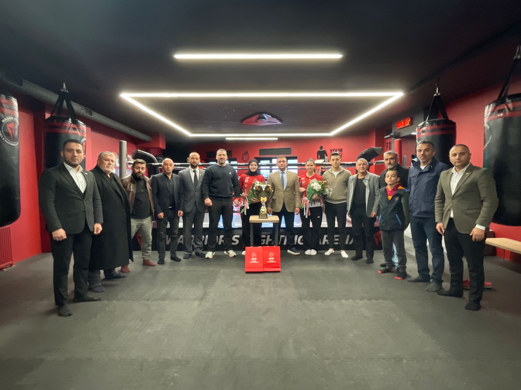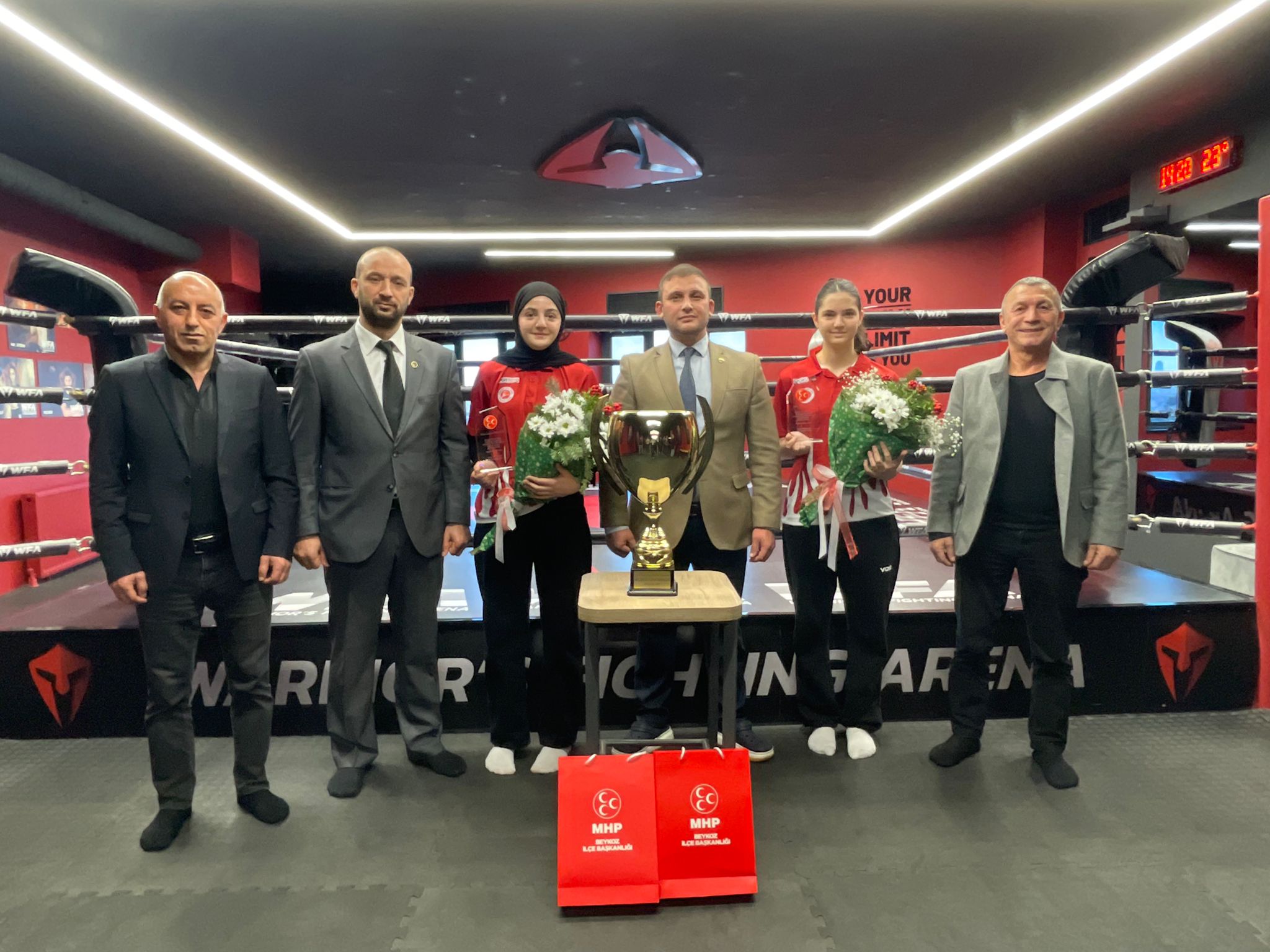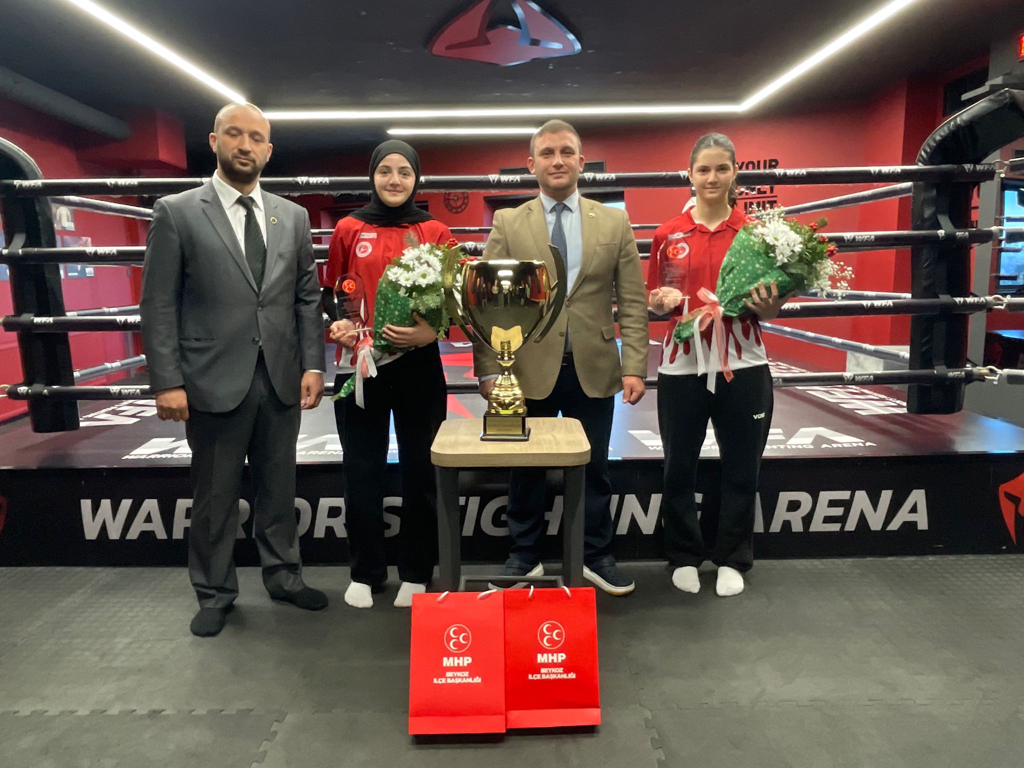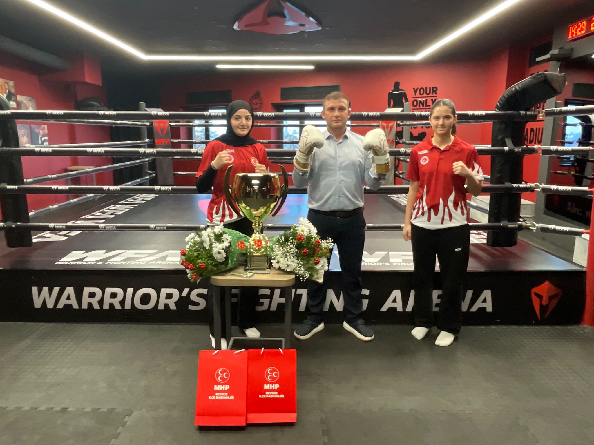 MHP Beykoz İlçe Başkanı Emre Çömlekçi, dünya Kickboks şampiyonu olan Meryem Naz ve Beyza Su Ayas kardeşlere plaket takdim ederek başarılarının devamını diledi.