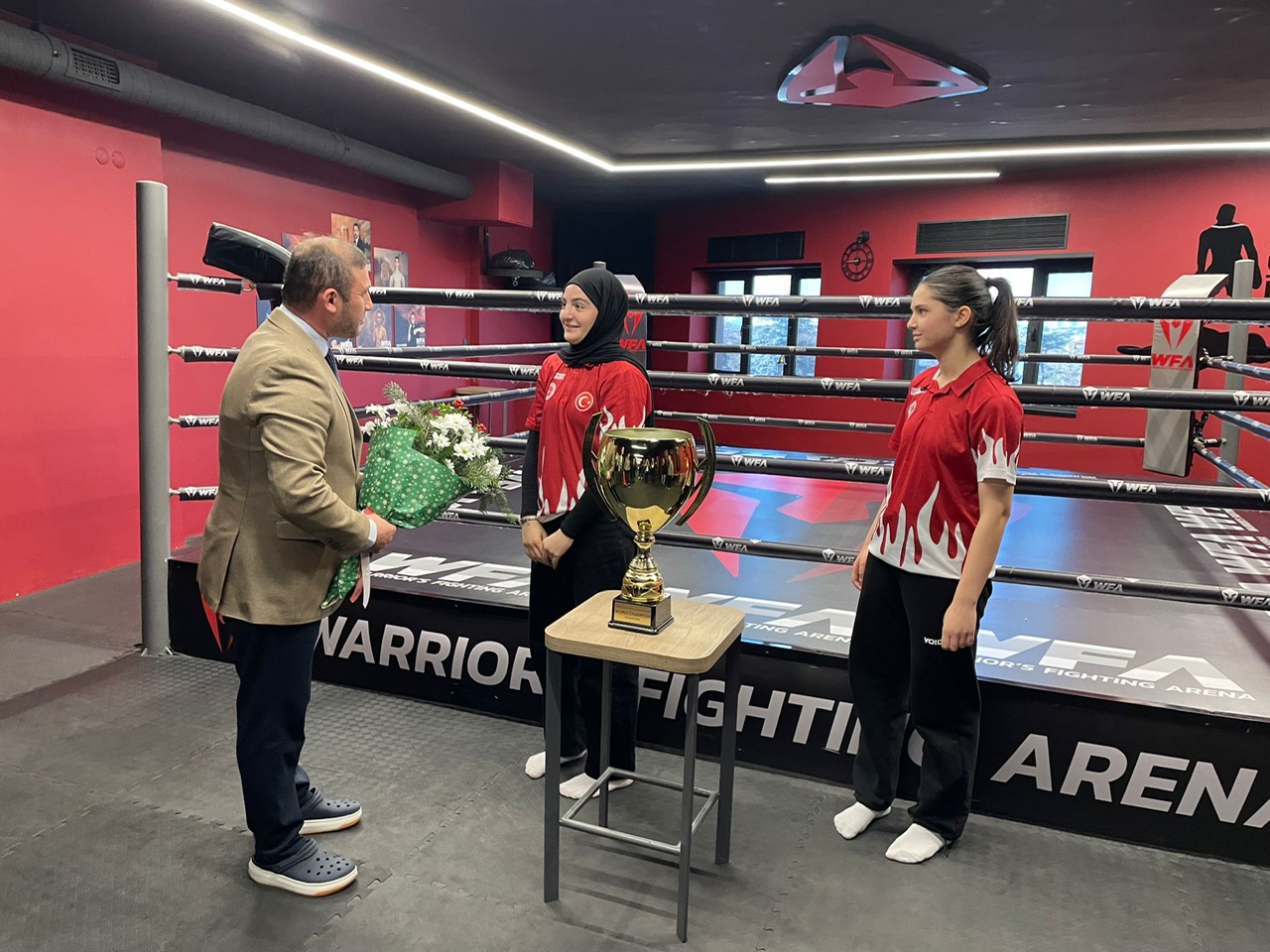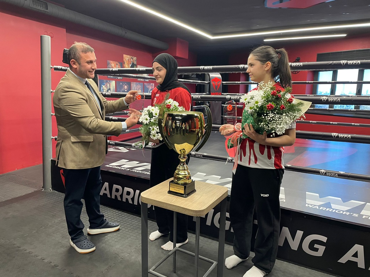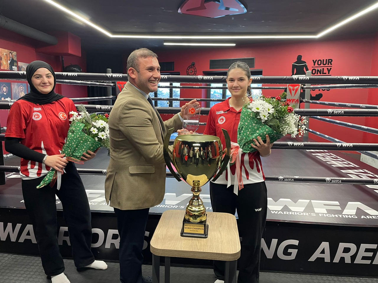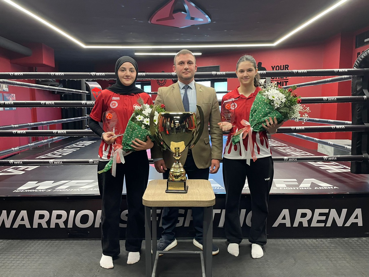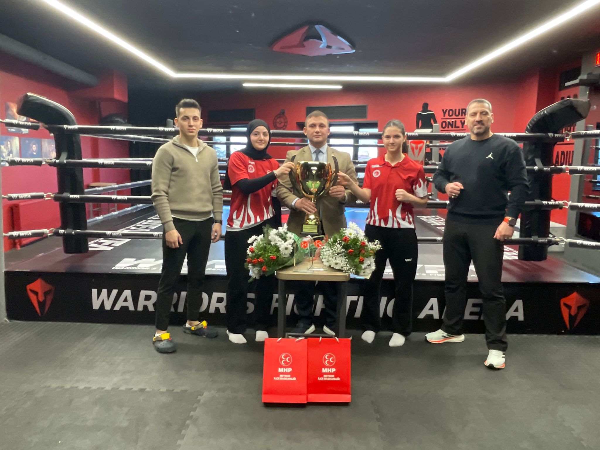 MHP Beykoz İlçe Başkanı Emre Çömlekçi, dünya Kickboks şampiyonu olan Meryem Naz ve Beyza Su Ayas kardeşlere plaket takdim ederek başarılarının devamını diledi.