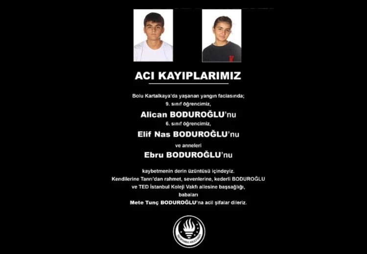 Mesajda, “Bolu Kartalkaya’da yaşanan yangın faciasında 9. sınıf öğrencimiz, Alican BODUROĞLU’nu 6. sınıf öğrencimiz, Elif Nas BODUROĞLU’nu ve anneleri Ebru BODUROĞLU’nu kaybetmenin derin üzüntüsü içindeyiz. Kendilerine Tanrı’dan rahmet, sevenlerine, kederli BODUROĞLU ve TED İstanbul Koleji Vakfı ailesine başsağlığı, babaları Mete Tunç BODUROĞLU’na acil şifalar dileriz.”Milli Yas ilan edildi