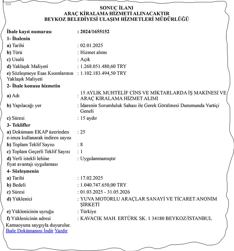Beykoz Belediyesi ile Yuva Motorlu Araçlar şirketi arasında 17 Şubat 2025 tarihinde 1 milyar 196 milyon TL değerinde ihale sözleşmesi imzalandı. Şirket, 15 ay boyunca belediyeye kiralık araç hizmeti sağlayacak.