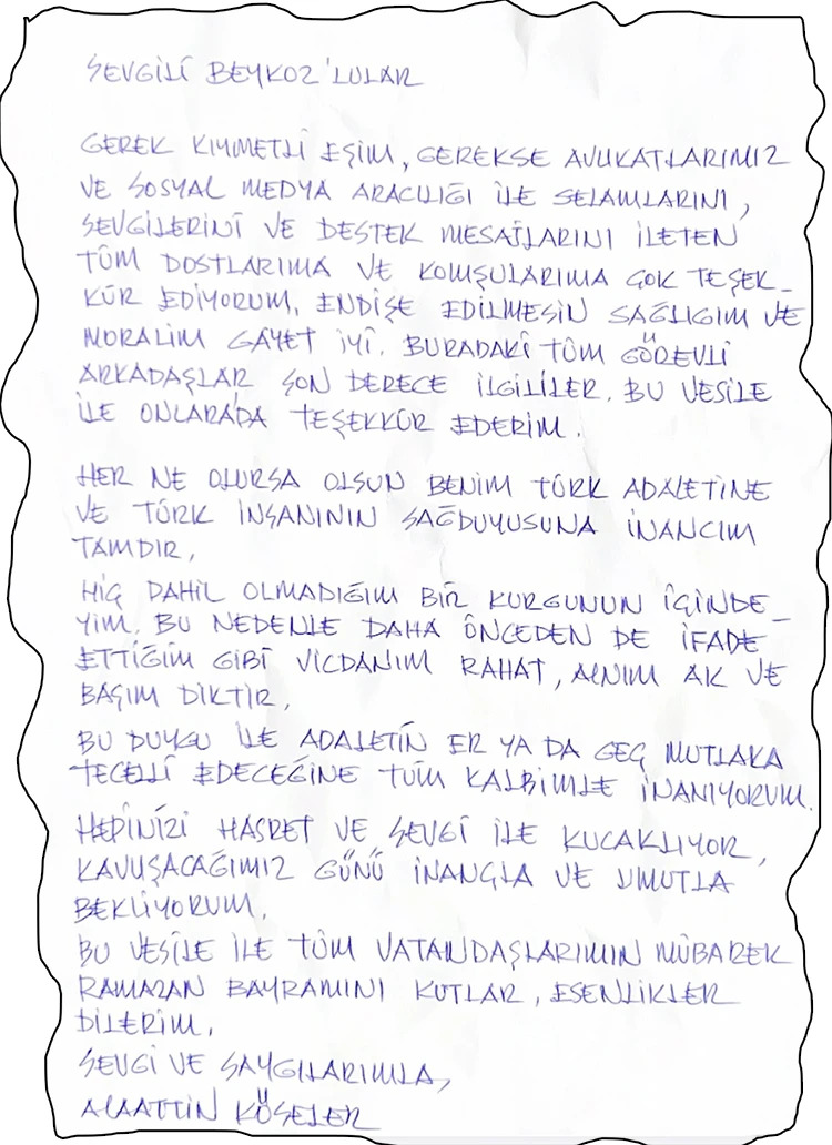 Köseler, mektubunda kendisine destek veren, selam gönderen ve durumunu merak eden herkese teşekkür etti. Cezaevinde görevlilerin kendisine son derece ilgili davrandığını belirten Köseler, Beykoz halkının Ramazan Bayramı’nı da kutladı.