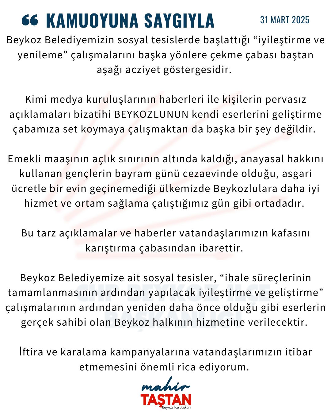 Beykoz Belediyesi’nin sosyal tesislerinde başlatılan yenileme ve iyileştirme çalışmalarına yönelik eleştirilere Cumhuriyet Halk Partisi Beykoz İlçe Başkanı Mahir Taştan’dan yanıt geldi. Taştan, konunun çarpıtılmaya çalışıldığını belirterek, vatandaşlara seslendi.
