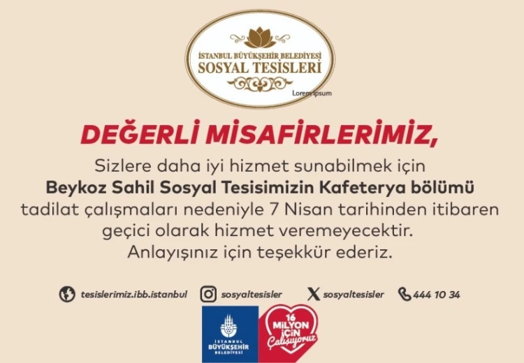 “Sizlere daha iyi hizmet sunabilmek için Beykoz Sahil Sosyal Tesisimizin Kafeterya bölümü tadilat çalışmaları nedeniyle 7 Nisan tarihinden itibaren geçici olarak hizmet veremeyecektir. Anlayışınız için teşekkür ederiz.”
