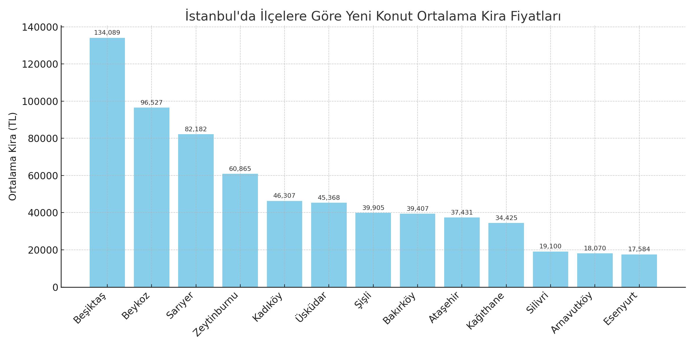 İstanbul’da yeni konut kiralarının ilçelere göre dağılımını gösteren grafik yukarıda yer alıyor. Beykoz, 96.527 TL ortalama kira bedeliyle Beşiktaş’ın ardından ikinci sırada bulunuyor.