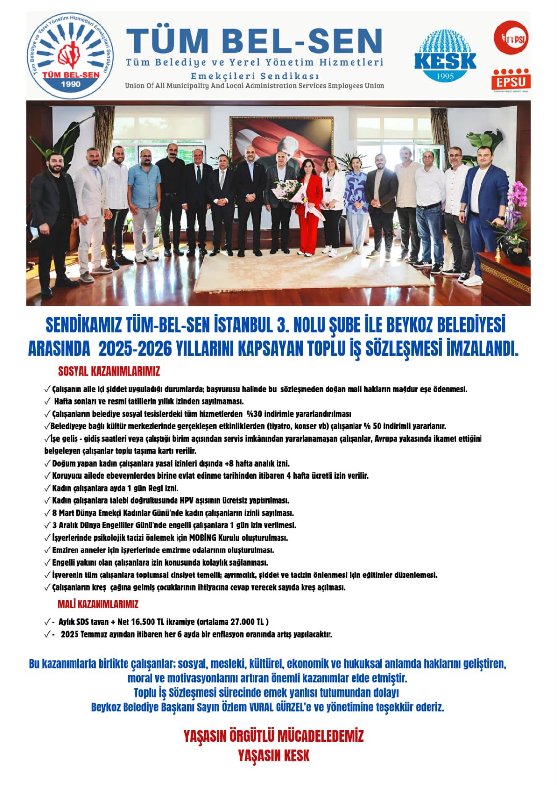 Beykoz / İstanbul — Beykoz Belediyesi ile Tüm Belediye ve Yerel Yönetim Hizmetleri Emekçileri Sendikası (TÜM BEL-SEN) İstanbul 3 No’lu Şubesi arasında 14 aydır süren Toplu İş Sözleşmesi (TİS) süreci nihayet sonuçlandı. 2025–2026 yıllarını kapsayan sözleşme, Beykoz Belediye Başkan Vekili Özlem Vural Gürzel ve sendika temsilcilerinin katılımıyla imzalandı.İmza töreni, belediye başkanlık makamında; TÜM BEL-SEN İstanbul 3 No’lu Şube Başkanı Hıdır Demirtaş, sendika yöneticileri ve belediye çalışanlarının katılımıyla gerçekleşti. Uzun süredir devam eden pazarlık sürecinin ardından sağlanan uzlaşı, çalışanlar arasında memnuniyetle karşılandı.