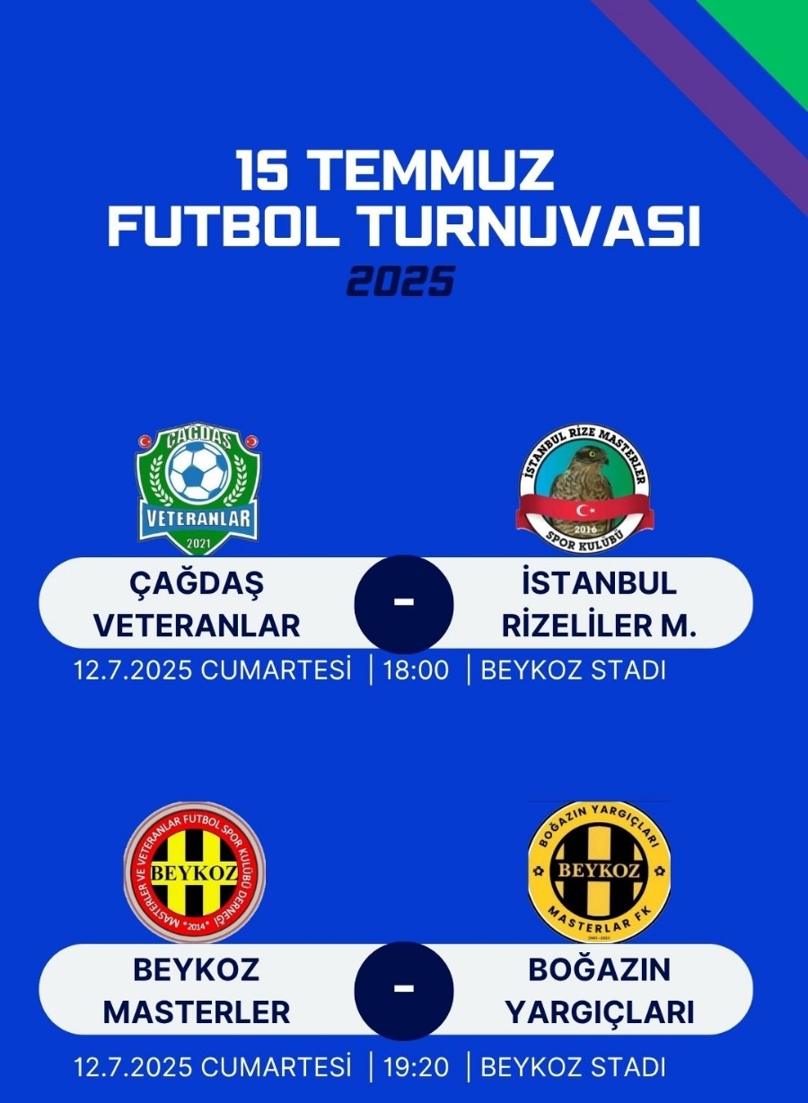 15 Temmuz Demokrasi ve Milli Birlik Günü kapsamında düzenlenen Veteranlar Futbol Turnuvasının maç gün ve saatleri netleşti. Beykoz Kaymakamlığı’nın onayı ve Beykoz İlçe Gençlik ve Spor Müdürlüğü koordinasyonunda düzenlenen turnuva, futbolseverleri bir araya getirecek.