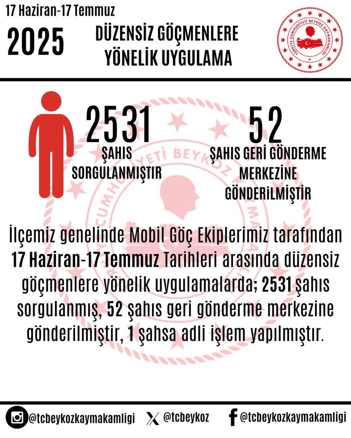 “Mobil Göç Aracımızda, Beykoz İlçe Emniyet Müdürlüğü ekiplerimizce 17 Haziran – 17 Temmuz 2025 tarihleri arasında düzensiz göçmenlere yönelik denetimler gerçekleştirilmiştir. Bu kapsamda, ilçe genelinde 2.531 şahıs sorgulanmış, 52 kişi geri gönderme merkezine intikal ettirilmiş, 1 kişiye adli işlem uygulanmıştır. Beykoz’umuzun huzuru ve güvenliği için 7/24 esasına göre çalışmaya devam ediyoruz.”