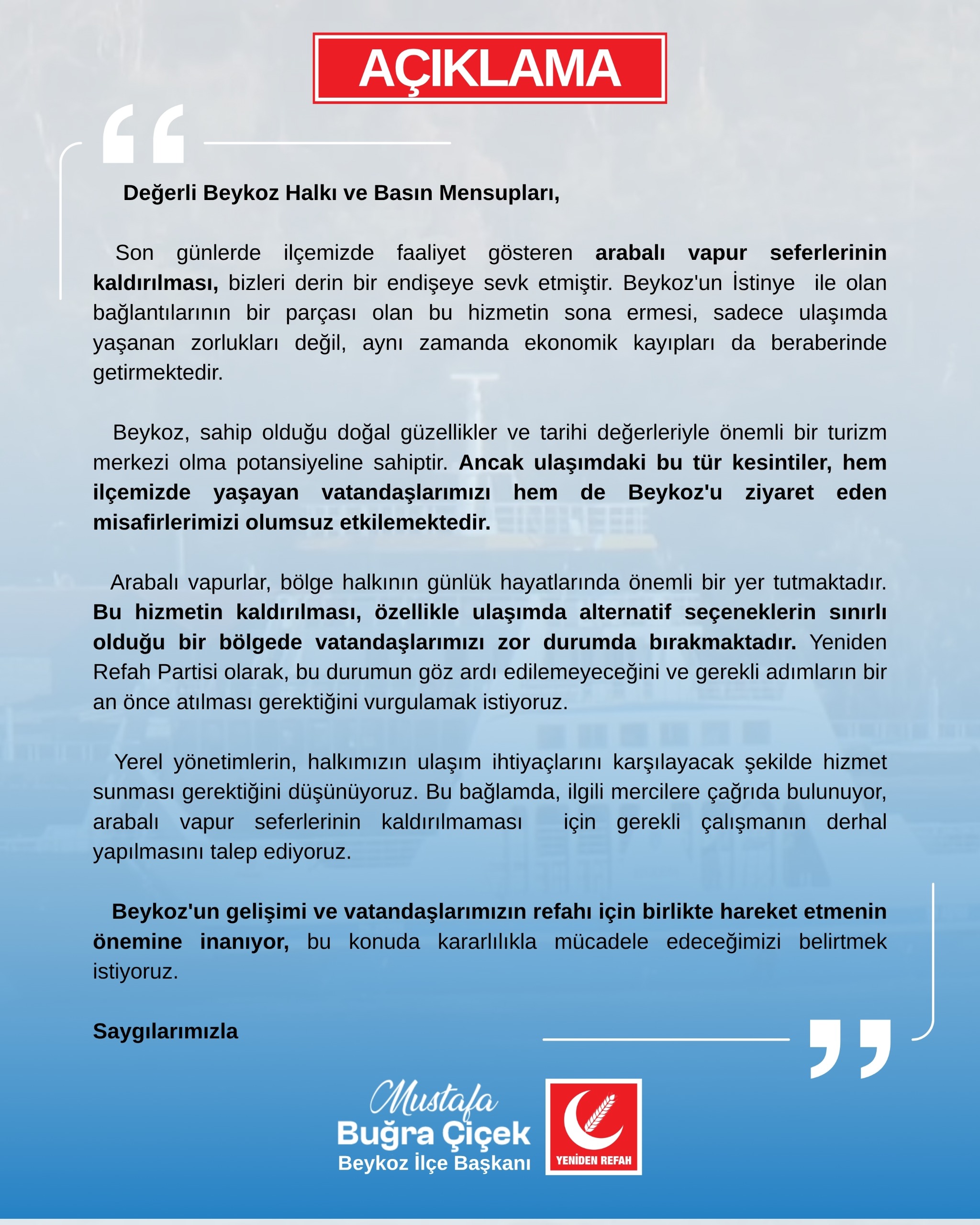 Yeniden Refah Partisi Beykoz İlçe Başkanı Mustafa Buğra Çiçek, son günlerde Çubuklu-İstinye arasında hizmet veren arabalı vapur seferlerinin kaldırılmasına yönelik bir basın açıklaması yaptı. Çiçek, söz konusu kararın ilçe halkını hem ulaşım hem de ekonomik açıdan olumsuz etkilediğini belirtti.
