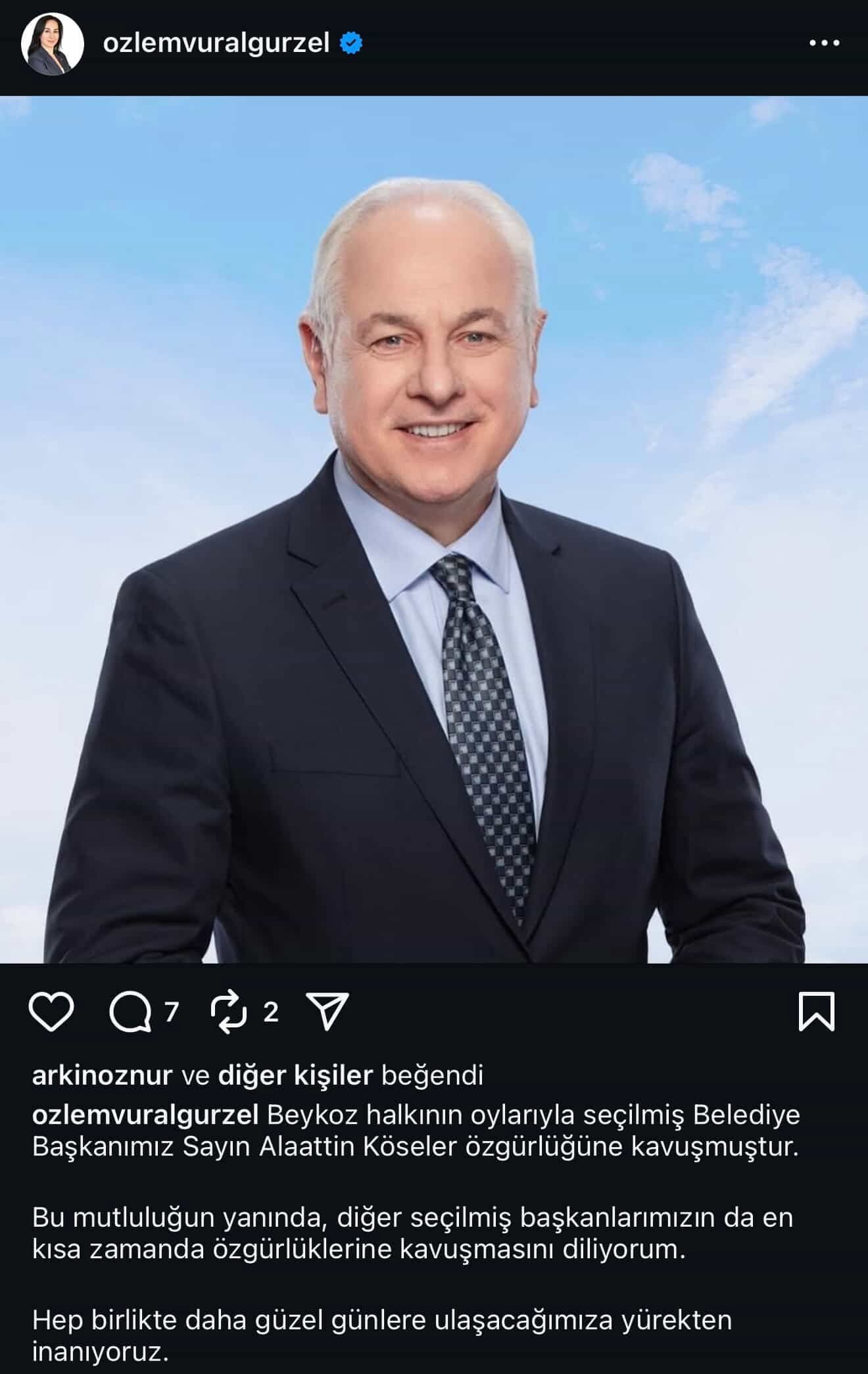 Gürzel paylaşımında, “Beykoz halkının oylarıyla seçilmiş Belediye Başkanımız Sayın Alaattin Köseler özgürlüğüne kavuşmuştur. Bu mutluluğun yanında, diğer seçilmiş başkanlarımızın da en kısa zamanda özgürlüklerine kavuşmasını diliyorum. Hep birlikte daha güzel günlere ulaşacağımıza yürekten inanıyoruz” ifadelerine yer verdi.