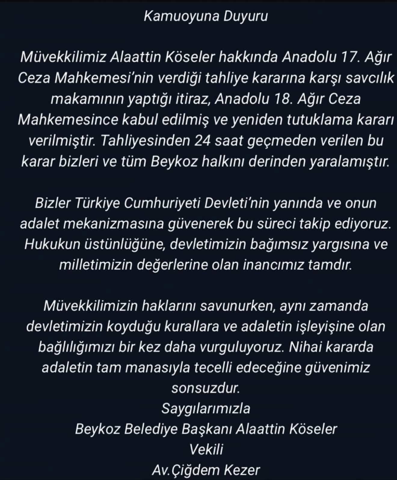 “Müvekkilimiz Alaattin Köseler hakkında Anadolu 17. Ağır Ceza Mahkemesi’nin verdiği tahliye kararına karşı savcılık makamının yaptığı itiraz, Anadolu 18. Ağır Ceza Mahkemesi’nce kabul edilmiş ve yeniden tutuklama kararı verilmiştir. Tahliyesinden 24 saat geçmeden verilen bu karar bizi ve tüm Beykoz halkını derinden yaralamıştır.