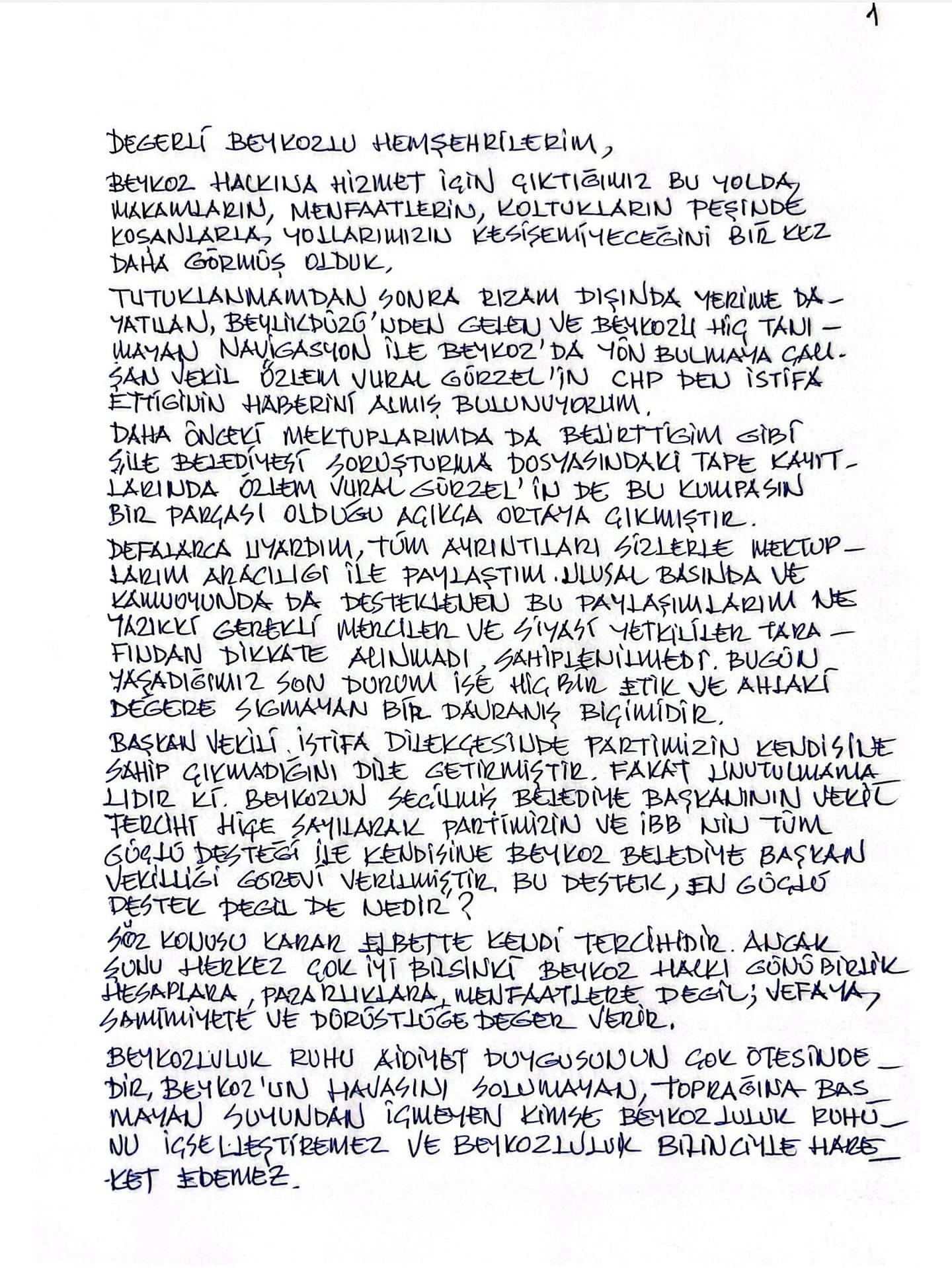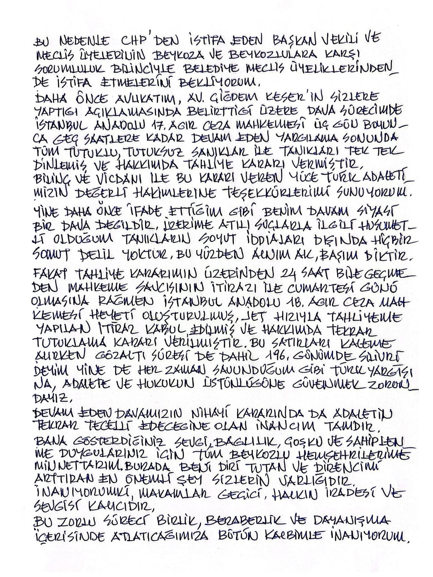 “Bana gösterdiğiniz sevgi, bağlılık, coşku ve sahiplenme duygularınız için tüm Beykozlu hemşehrilerime minnettarım. Burada beni diri tutan ve direncimi artıran en önemli şey, sizlerin varlığıdır. İnanıyorum ki makamlar geçici, halkın iradesi ve sevgisi kalıcıdır. Bu zorlu süreci birlik, beraberlik ve dayanışma içerisinde atlatacağımıza bütün kalbimle inanıyorum.”