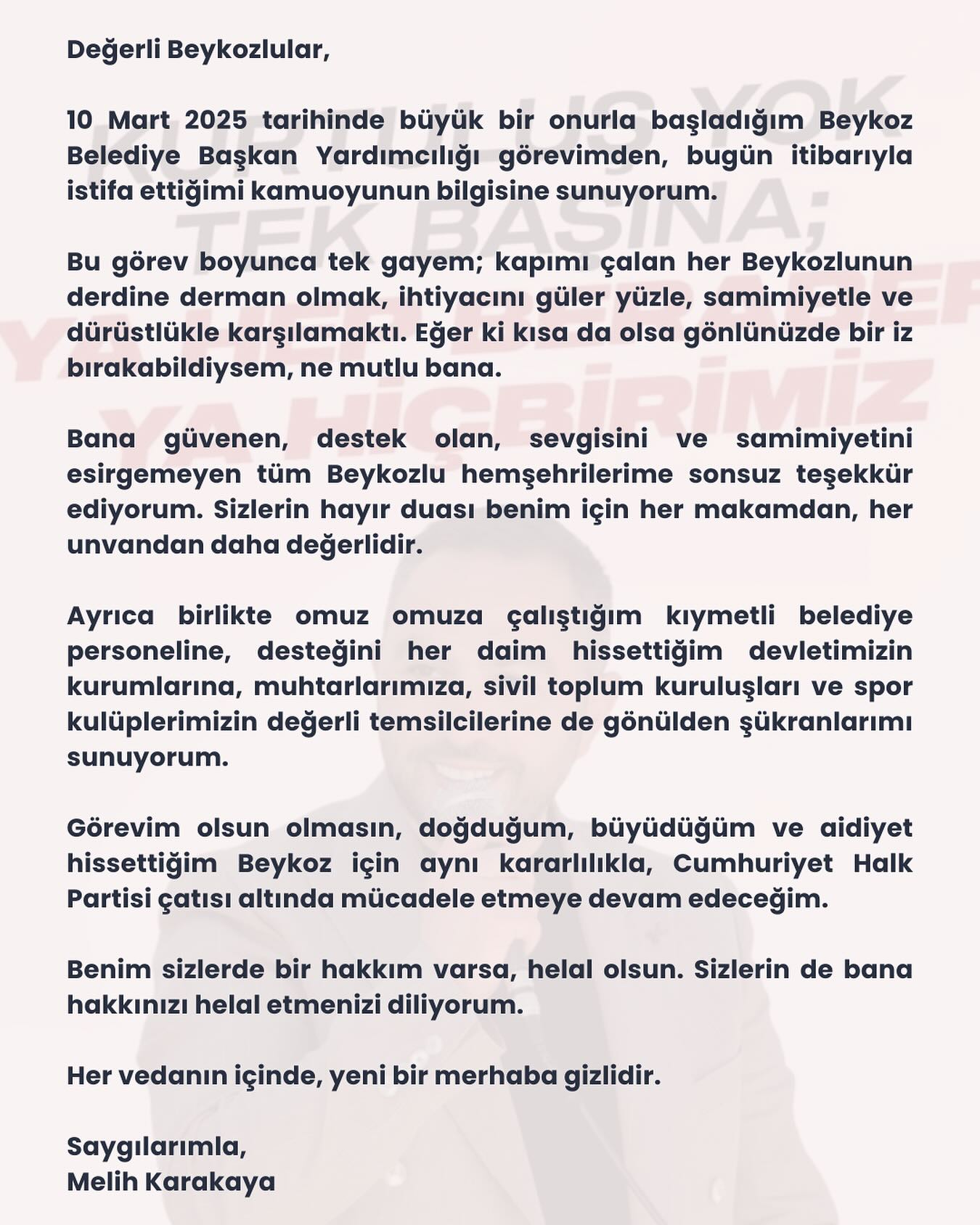 Karakaya, 10 Mart 2025 tarihinde başladığı Beykoz Belediye Başkan Yardımcılığı görevinden bugün itibarıyla ayrıldığını belirtti. Görev süresince önceliğinin Beykozluların ihtiyaçlarını karşılamak ve sorunlarına çözüm bulmak olduğunu ifade eden Karakaya, “Bana güvenen, destek olan, sevgisini ve samimiyetini esirgemeyen tüm Beykozlu hemşehrilerime sonsuz teşekkür ediyorum. Sizlerin hayır duası benim için her makamdan, her unvandan daha değerlidir. Ayrıca birlikte omuz omuza çalıştığım kıymetli belediye personeline, desteğini her daim hissettiğim devletimizin kurumlarına, muhtarlarımıza, sivil toplum kuruluşları ve spor kulüplerimizin değerli temsilcilerine de gönülden şükranlarımı sunuyorum.” ifadelerini kullandı.