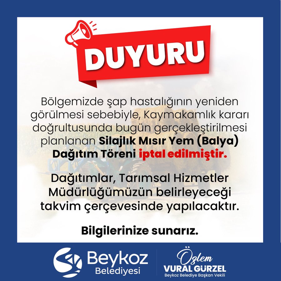 “Bölgemizde şap hastalığının yeniden görülmesi sebebiyle, Kaymakamlık kararı doğrultusunda bugün gerçekleştirilmesi planlanan Silajlık Mısır Yem (Balya) Dağıtım Töreni iptal edilmiştir. Dağıtımlar, Tarımsal Hizmetler Müdürlüğümüzün belirleyeceği takvim çerçevesinde yapılacaktır.”