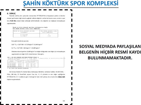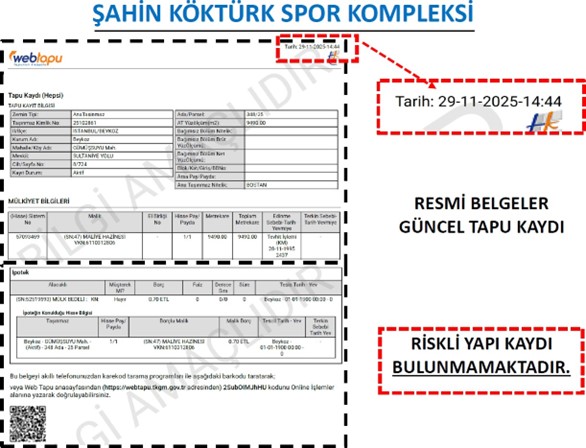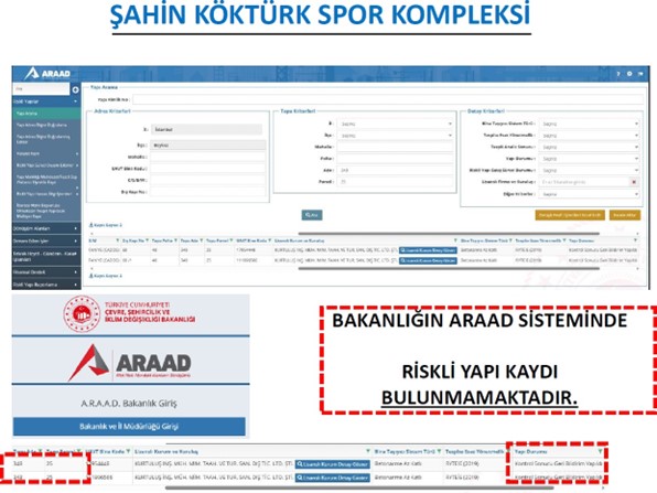 Karaçam’ın açıklamasında Türkiye’de bir yapının “Riskli Yapı” kabul edilebilmesi için Çevre, Şehircilik ve İklim Değişikliği Bakanlığı’nın ARAAD sistemine teknik rapor yüklenmesi, Bakanlıkça onaylanması ve tapu kaydına resmi şerh düşülmesi gerektiği vurgulandı.Bakanlığın güncel kayıtlarında R. Şahin Köktürk Spor Kompleksi için herhangi bir riskli yapı şerhi bulunmadığı, tapu kaydında da böyle bir kayıt olmadığı ifade edildi.
