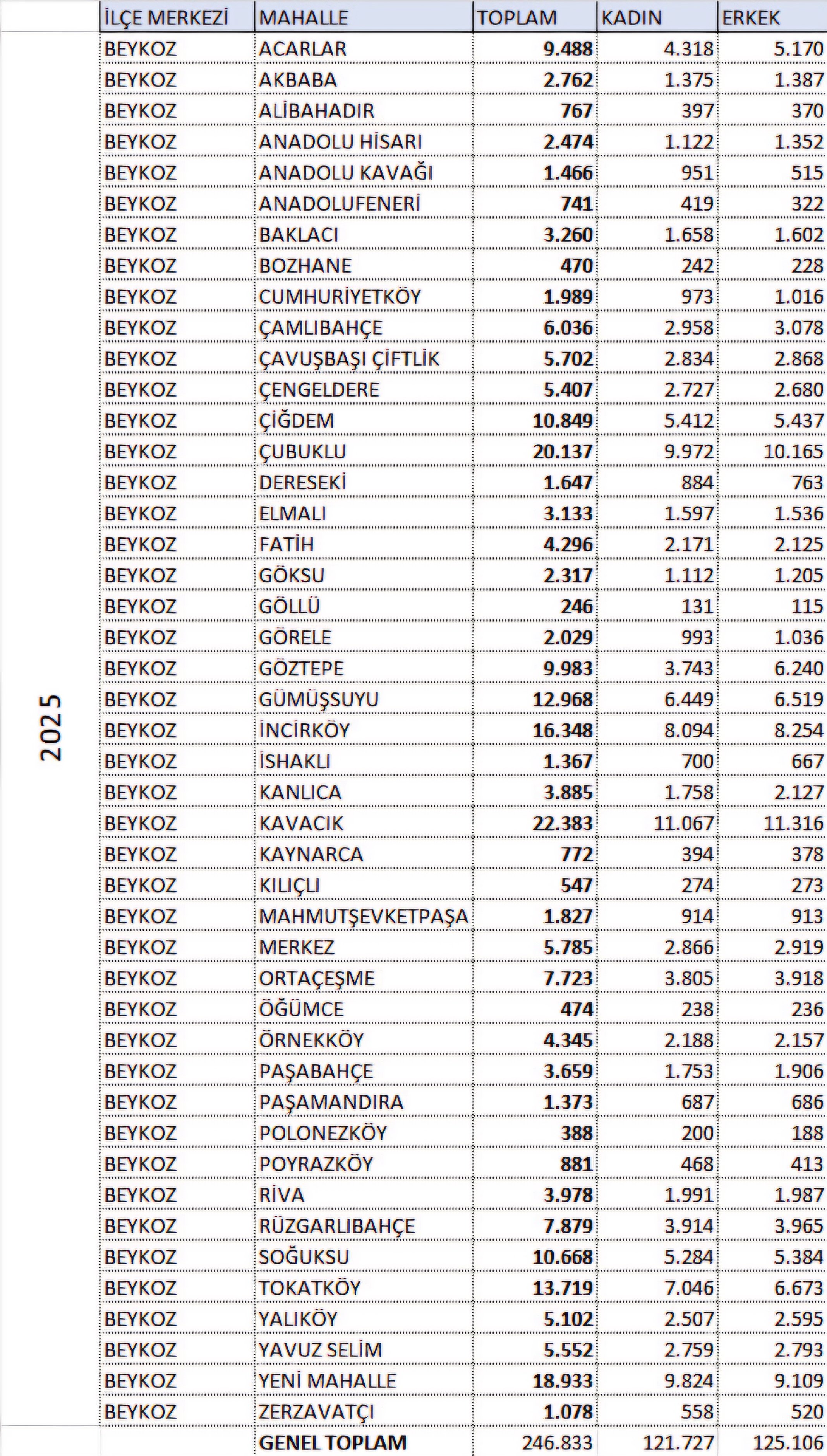 TÜİK’in açıkladığı 2025 yılı nüfus sayılarına göre Beykoz’un nüfusu 246 bin 833 oldu.